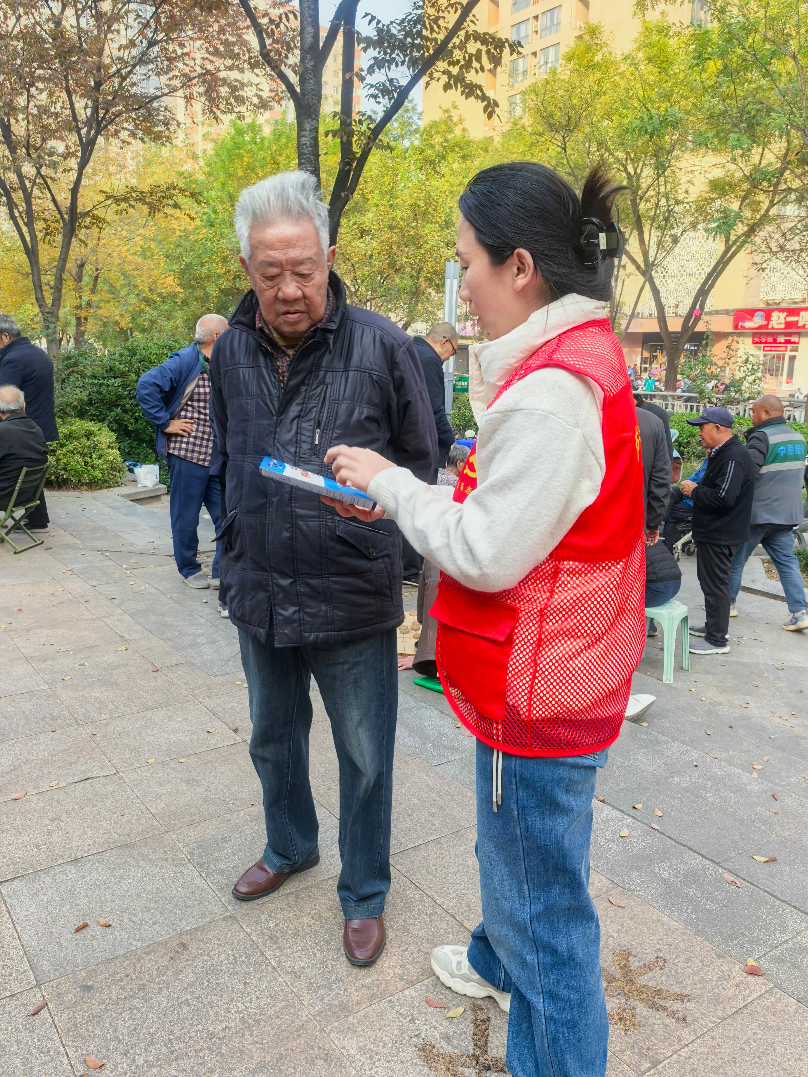活动现场,志愿者们主动走向人群,特别是围绕在休闲娱乐的老年人身边,结合近期高发的“养老金骗局”、“冒充熟人诈骗”、“虚假中奖”、“保健品推销”等典型案例,用通俗易懂的方言口语,生动剖析了诈骗分子的常用伎俩和话术陷阱。提醒大家要时刻保持警惕,做到不贪图小便宜、不轻信花言巧语,遇到可疑情况第一时间与家人沟通或拨打报警电话。